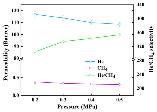 According to the above gas permeability results, when the doping amount of HNTs@ZIF-67 is 5 wt%, MMMs have the most excellent gas separation performance. Therefore, the MMMs under a doping amount of 5 wt% were chosen to explore the effect of pressure on their performance. As shown in Figure 14, with the pressure increases, there is a gradual reduction in the permeability of He and CH4, accompanied by a gradual increase in selectivity. The cause of this phenomenon is that the increase in pressure reduces the distance between the polymer chains and between polymer chains and fillers, resulting in a denser polymer, a smaller free volume, and a decrease in permeability. However, the kinetic diameter of CH4 is larger than that of He, making it more difficult for CH4 to pass through the compressed membrane relative to He, resulting in the increased He/CH4 selectivity of MMMs.