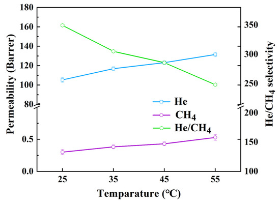 Figure 15 shows the influence of different temperatures on the performance of MMMs. It can be seen that the permeability of He and CH4 increases with the increase in temperature, while the selectivity is in a downward trend. The reason is that a higher temperature gives higher potential energy to gas molecules and promotes the diffusion of gas. Meanwhile, high temperature also increases the movement of polymer chains, resulting in a decrease in mass transfer resistance. The increase in permeability of CH4 is larger than that of He, which ultimately leads to a decrease in selectivity. The observed higher methane permeability relative to helium can be attributed to three key factors: