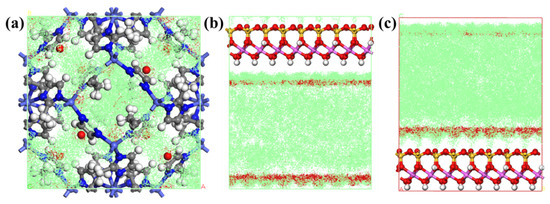 Based on molecular dynamics, the interaction between the adsorbate and the surface of the porous material is obtained by the Monte Carlo algorithm [23,24], and then the adsorption isotherm surface, the adsorption energy field, and the adsorption density field can be obtained, to determine the adsorption site of the adsorbate in the material. In this work, the Sorption module is used to obtain the density field of gas molecules in the research system based on the Grand Canonical Monte Carlo [14].