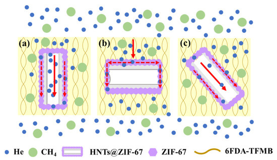 Schematic diagram of the gas permeation mechanism of HNTs@ZIF-67/6FDA-TFMB membranes. (a) Horizontal states, (b) vertical states, (c) inclined states.