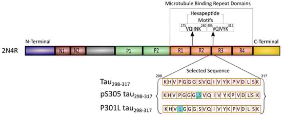 Schematic representation of the primary sequence of full-length tau (2N4R). The sequences of the fragment peptide tau298–317 and mutants are shown.