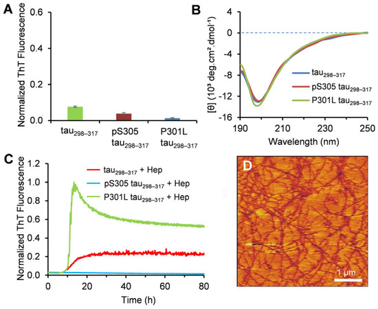 The in vitro aggregation of tau is usually induced by external factors such as glycosaminoglycans (GAGs), ribonucleic acids, and fatty acids [41,42,43], which may act as catalytic scaffolds to reduce the energy barrier of nucleation-dependent amyloidogenesis. Prior work demonstrated that heparin (Hep), a negatively charged and sulfated polysaccharide, promotes the aggregation of tau298–317 while failing to induce fibril formation of pS305 tau298–317 [28]. The results in the present study showed that Hep also significantly enhances the aggregation of P301L tau298–317 (Figure 2C). A fast growth phase in aggregation kinetics was observed when P301L tau298–317 (12.5 μM) was co-incubated with Hep (1.5 μM). The maximum fluorescence intensity was approximately 4.4 times that of the WT tau298–317. AFM imaging further confirmed the formation of dense amyloid fibrils in the P301L tau298–317 samples (Figure 2D). These results indicate that the P301L mutation significantly increases the aggregation propensity of the fragment peptide, which is consistent with previous reports that the mutation also promotes aggregation of full-length tau [44,45].