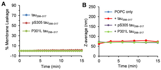 Maintaining cell membrane integrity is essential for normal ion homeostasis and signal transduction across the cell membrane. Neuronal membrane damage due to interactions with various amyloidogenic proteins, such as Aβ, α-synuclein, and tau, has been implicated in neuronal toxicity [46,47,48]. Therefore, a mechanistic understanding of the interactions between tau and phospholipids may provide essential insights into the pathophysiology of tauopathies. Here, we first used liposomes composed of zwitterionic POPC as model membranes and assessed the peptide-induced membrane disruption using a dye leakage assay. Phosphatidylcholine (PC) is the most abundant phospholipid in eukaryotic cell membranes [49]. As shown in Figure 3A, adding 12.5 μM tau298–317 peptide or the mutants did not induce observable dye release, indicating that the peptides do not strongly interact with zwitterionic POPC to impair membrane integrity. To further validate these findings, we used dynamic light scattering (DLS) to monitor the change in liposome hydrodynamic diameter (Z-avg) over time. Consistent with the dye leakage results, no significant change in vesicle size was observed (Figure 3B and Fiigure S2), suggesting minimal interaction between tau298–317 (or its mutants) and POPC vesicles.