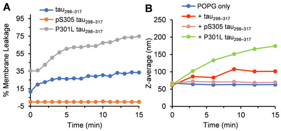 (A) Membrane leakage of POPG vesicles (100 µM) induced by tau298–317, pS305 tau298–317, or P301L tau298–317 (12.5 µM) at 25 °C in pH 7.4 buffer (50 mM Na-phosphate). (B) Hydrodynamic size of POPG vesicles (100 µM) measured by DLS at different time points in the presence of 12.5 µM tau298–317, pS305 tau298–317, or P301L tau298–317.
