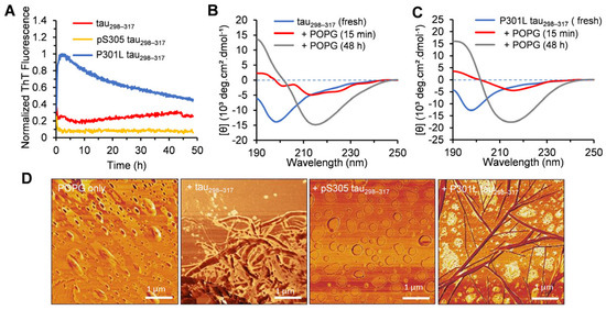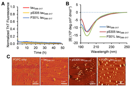 The following supporting information can be downloaded at: https://www.mdpi.com/article/10.3390/membranes15070208/s1. Figure S1: Tapping-mode AFM images of tau298–317 (A), pS305 tau298–317 (B), and P301L tau298–317 (C) samples collected at the end of the aggregation kinetics experiment. Figure S2: Time-dependent changes in the hydrodynamic size of POPC (100 µM) vesicles in the absence or the presence of different concentrations of tau298–317 (A), pS305 tau298–317 (B), or P301L tau298–317 (C) in pH 7.4 buffer (50 mM Na-phosphate). Figure S3: (A) Normalized aggregation kinetics of 50 µM tau298–317 and the mutants in the presence of 100 µM POPG followed by ThT fluorescence at 25 °C in pH 7.4 buffer (50 mM Na-phosphate). (B) Normalized aggregation kinetics of 100 µM tau298–317 and the mutants in the presence of 100 µM POPG. (C) AFM images of 100 µM tau298–317 and the mutants in the presence of POPG. The samples for AFM were collected at the end of the aggregation kinetics shown in (B). Figure S4: Time-dependent changes in the hydrodynamic size of POPG (100 µM) vesicles in the absence or the presence of different concentrations of tau298–317 (A), pS305 tau298–317 (B), or P301L tau298–317 (C) in pH 7.4 buffer (50 mM Na-phosphate). Figure S5: CD spectra of 50 μM pS305 tau298–317 in the presence of 100 μM POPG obtained after 48 h of incubation at 25 °C in pH 7.4 buffer (10 mM Na-phosphate).