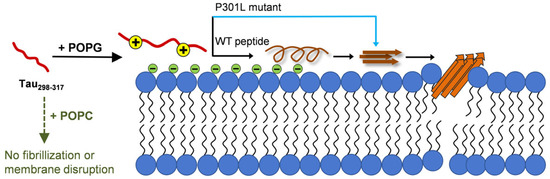 In contrast, POPG has a negatively charged phosphate head group, which strongly interacts with Lys and His residues in tau298–317 through electrostatic attractions. It has been reported that substituting Lys311 with Ala (K311A) in the PHF6 hexapeptide region of tau significantly weakens the complex formation of tau and negatively charged phosphatidylserine vesicles [12]. The rapid dye leakage and increase in hydrodynamic diameter upon adding tau298–317 to POPG vesicles suggest strong interactions, especially electrostatic interactions that drive peptide–membrane complex formation. As illustrated in a proposed schematic model (Figure 7), peptide adsorption onto the membrane surface may induce a conformation conversion from a disordered state to more ordered structures containing a transient α-helical conformation. The localized accumulation of tau298–317 with an ordered structure on the membrane surface reduces intermolecular electrostatic repulsion and nucleation barriers, facilitating subsequent self-association into oligomers and larger β-sheet-rich fibrillar structures, which further lead to membrane leakage. Although our current data could not directly identify the specific tau fragment aggregate species responsible for membrane disruption, the rapid onset of vesicle leakage suggests that early-formed, small oligomeric species are the most likely mediators of membrane damage. Phosphorylation on the peptide inhibits both peptide-induced membrane damage and membrane-mediated peptide aggregation, further suggesting the critical role of electrostatic interactions in early peptide-membrane binding and the subsequent effects on membrane integrity and peptide aggregation.