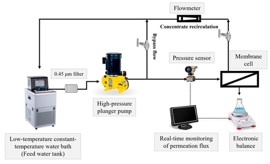 Membrane filtration experiments were conducted using a self-made cross-flow membrane filtration system (as illustrated in Figure 2), with the membrane cell sourced from Sterlitech Corporation (CF016P, Auburn, WA, USA). The effective membrane area in this cell was 20.6 cm2. For the modified PVDF substrate, the filtration test commenced by pre-pressurizing the membrane with pure water at 2 bar until a steady flux was achieved. Measurements were then conducted under a pressure of 1 bar at 25 °C. In the case of the PVDF-supported TFC NF membrane, the filtration test began with pre-pressurization using pure water at 6 bar until a steady flux was attained. Subsequently, measurements were performed at 5 bar and 25 °C, with a cross-flow velocity of 0.45 m/s to reduce concentration polarization. The pure water permeance (PWP, L·m−2·h−1·bar−1) was calculated according to Equation (1). In this equation, A is the effective membrane area (m2), Δt is the time interval (h), ΔP is the trans-membrane pressure (bar), and V is the permeate volume (L).