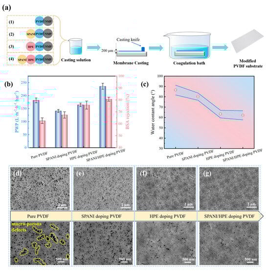 PVDF powder, NMP, HPE, and SPANI were used to prepare the casting solution. The PVDF powder intended for membrane preparation should be vacuum-dried for 24 h at a pressure of −0.08 MPa and a temperature of 60 °C. During the preparation of the casting solution, HPE (4 wt%) or SPANI (0.3 wt%) was first added to the NMP solvent, followed by stirring with a magnetic stirrer for 15 min and ultrasound dispersion for 30 min. Afterward, PVDF powder (19 wt%) was added to the mixture and mechanically mixed for 24 h to obtain a homogeneous casting solution. The casting solution should be placed in a vacuum oven, with the pressure set between −0.08 MPa and −0.06 MPa, and then degassed at 25 °C for 24 h to achieve a uniform and stable casting liquid. Then it can be cast onto the PET nonwoven fabric fixed on the glass sheet using a casting knife. The thickness of the casting solution was fixed at 200 μm. The membrane obtained after casting was subsequently immersed in a coagulation bath (pure water at 25 °C) for 24 h to facilitate phase inversion.
