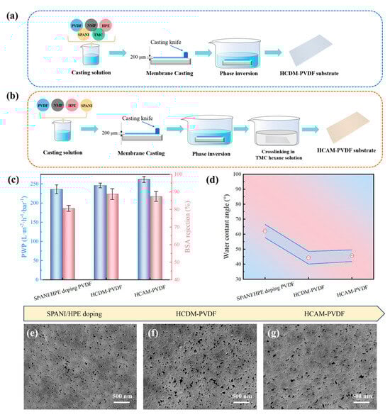 Property evaluation of PVDF-based substrate. (a) Illustrative diagram of preparation procedure. (b) Separation performance (c) water contact angle and (d–g) SEM surface morphology of modified PVDF substrates.