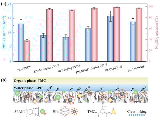 To harness the modification effects of both SPANI and HPE, a substrate denoted as SPANI/HPE doping PVDF was prepared and tested. Interestingly, there seems to be some synergistic modification effect between SPANI and HPE. In comparison to HPE doping PVDF, SPANI/HPE doping PVDF presented a similar water contact angle and more even pore size distribution. Consequently, a significant enhancement in both PWP (~230 L m−2 h−1 bar−1) and BSA rejection (~81%) was produced, as shown in Figure 3b. However, the BSA rejection rate of 81% was still inadequate, and the water contact angle of 62.1° was not sufficiently low. According to previous research [30,31,32], the water contact angle of a substrate for TFC NF membrane preparation should be lower than 50°.