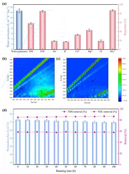 The demand for high-quality drinking water has catalyzed the focus on advanced treatment technologies for municipal tap water production [33]. Taking the group Health Drinking Water Quality Standard (T/BJWA 001-2021) [34] in China as example, it imposes more stringent requirements, specifying TDS levels of 50~300 mg/L and TOC ≤ 1.0 mg/L. In the context of this trend, NF technology has emerged as a promising candidate due to its high-quality effluent [35]. To assess the viability of the NF membrane fabricated on the HCDM-PVDF substrate, it was used to treat the tap water sourced from the municipal network in the Hongqiao District of Tianjin, China. The main quality indicators of this tap water are presented in Table 1. As depicted in Figure 6a, this NF membrane exhibited a notable tap water permeance of 15 L m−2 h−1 bar−1, alongside a moderate total dissolved solid (TDS) removal rate of 57.9%. Notably, the rejection rates of bivalent ions (SO42− (86.9%), Mg2+ (42.9%), and Ca2+ (32.6%)) were significantly higher than those of monovalent ions (Na+ (18.7%), K+ (17.3%), and Cl− (18.9%)). This discrepancy can be attributed to the larger hydration diameter and electric charge of the bivalent ions. Additionally, the organic matter removal efficiency of the NF membrane was assessed through TOC rejection, which revealed an excellent removal effect for TOC up to 85.3%. As shown in Table 1, the TOC of raw tap water was approximately 2.2 mg/L. After the NF treatment, this level was reduced to 0.32 mg/L, effectively meeting the high-quality drinking water standard of TOC < 1 mg/L. This proficiency in organic matter removal is conducive to ensuring the safety of drinking water. In addition, Excitation Emission Matrix (EEM) Spectra were employed to quantify the organic matter present within tap water before and after the NF treatment. In general, the fluorescence response regions of the EEM can be categorized as M, P, H, and F, corresponding to microbial products, proteins, humic acids, and fulvic acids, respectively [36]. As demonstrated in Figure 6b, only small amounts of fulvic acid (F region) and humic acid (H region) were detected in the raw tap water, reflecting its relatively clean quality. It is well known that fulvic acid and humic acid are types of natural organic matter (NOM). Despite their diversity and complexity, they typically possess large molecular weights. Therefore, the NF membrane is expected to effectively remove these substances with >96% rejection [37,38]. Consequently, as shown in Figure 6c, these fractions were detected at nearly negligible levels in the NF permeate water. These results demonstrated that the NF membrane constructed on the HCDM-PVDF substrate can significantly reduce the content of organic impurities in tap water, underscoring its exceptional ability to produce high-quality drinking water.