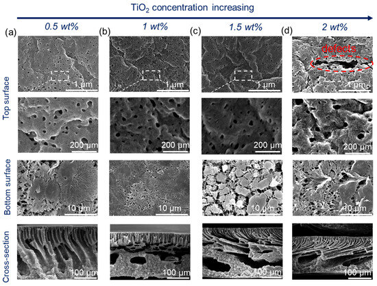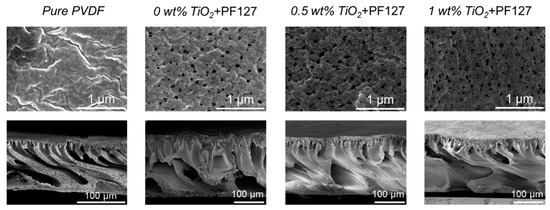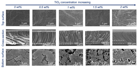 Membrane microstructures of PVDF/TiO2 composite membranes with different TiO2 contents: 15 wt% PVDF content, 5 wt% PF127, and coagulation temperature of 20 °C.