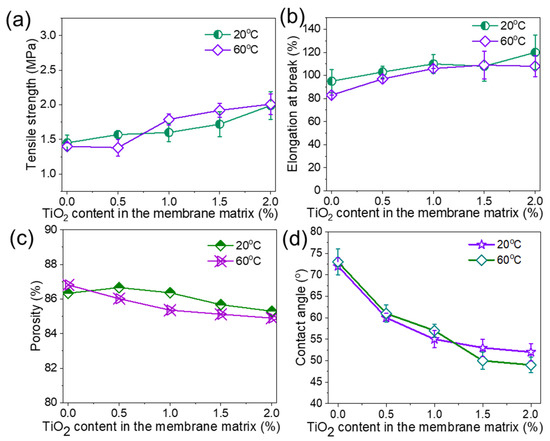 The physical properties and water transport performances of PVDF/TiO2 composite membranes are shown in Figure 4. Tensile strength and elongation at break slightly increased with TiO2 content. The main reason for this phenomenon is that the applied external force can be distributed on the polymer chains and NPs. Thus, the tensile strength can be improved, as the membrane samples do not break easily under higher forces [29,30]. In addition, the interaction between the PVDF and NPs enhances the rigidity and thus improves the mechanical strength, and these NPs could act as cross-linking agents to connect the polymer to the final membranes [31]. The porosity of these membranes slightly decreased from ~87% to 85% with an increase in TiO2 content (Figure 4c) due to the presence of these particles in part of the pore voids. Figure 4d shows the contact angles of the neat PVDF and composite membranes. Similar to mechanical strength and porosity, coagulation temperature had no obvious effect on surface hydrophilicity, as the hydrophilic performance of the composite membranes was mainly controlled by TiO2 concentration. The contact angle of the neat PVDF membranes was ~72°. As the content of TiO2 NPs increased, the contact angle decreased to ~52°.