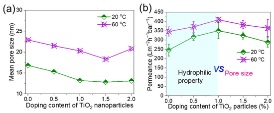 The effects of coagulation temperature and TiO2 content on the pore size and water permeance are presented in Figure 5a,b. In general, lower coagulation temperature and higher TiO2 content decreased the pore size [26,27] of the membrane. However, when the TiO2 content was increased to about 2 wt%, TiO2 aggregated, leading to an increase in membrane pore size. It was particularly obvious when the coagulation temperature was at 60 °C, which was consistent with the SEM images in Figure 3. The water permeance at both 20 °C and 60 °C increased and then decreased as the TiO2 content exceeded 1 wt%. This is because the hydrophilic aspect and pore size effect compete with each other [32], where the hydrophilic nature of TiO2 first enhances the water permeance while the decreased pore size dominates over 1 wt% TiO2 content. Therefore, as shown in Figure 5b, the water permeance increased to ~350 (20 °C) and ~ 409 Lm−2h−1bar−1 (60 °C) and then decreased to 302 and 384 Lm−2h−1bar−1, respectively, due to the synergistic effects of pore size and hydrophilic performance.