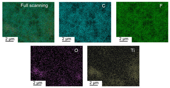 Well-dispersing TiO2 particles in the polymer matrix is very important for composite membranes because serious aggregation of TiO2 could destroy the integrity of the membrane and affect membrane porosity and resulting performance. Figure 7 shows the EDX-mapping of the PVDF/TiO2 composite membrane surface, demonstrating that the TiO2 particles are well dispersed in the PVDF matrix. There are two main reasons for this phenomenon. First, PolarClean is miscible with water, and TiO2 is very hydrophilic. Therefore, PolarClean and TiO2 could be dispersed well, although they are not completely miscible. Second, PF127 is a linear molecule with hydroxyl groups at both ends that form non-covalent interactions with TiO2 [36], resulting in good dispersion of PF127 and TiO2 in PolarClean. After dissolving PVDF powders in the PolarClean/TiO2/PF127 system, PVDF chains can connect with the methyl groups via hydrophobic interactions (van der Waals interaction). As a consequence, a well-dispersed solution can be formed at 140 °C.