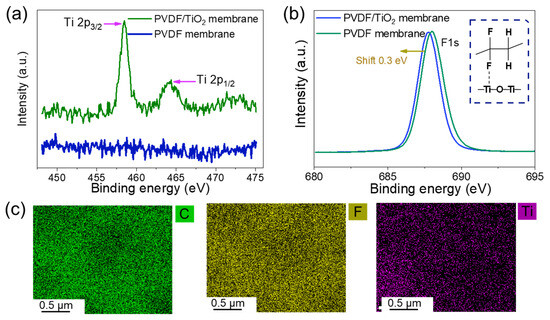 Here, we adopted XPS characterizations to measure the bonding strength of TiO2 particles and PVDF. Figure 8a shows the Ti XPS results of the PVDF membrane and PVDF/TiO2 composite membrane. As shown, only Ti peaks are observed in the composite membrane and are divided into Ti 2p1/2 and Ti 2p3/2 peaks situated at 464.38 eV and 458.48 eV, respectively. These peaks are assigned to Ti (IV), implying the existence of TiO2 nanoparticles in the composite membrane [37]. Figure 8b shows the XPS curves of the fluorine (F) atom from the two membranes. Note that the F peak of the composite membrane shifted about 0.3 eV toward the high binding energy region compared with the neat PVDF membranes. The shift demonstrated a coordination between F and Ti atoms [38]. Ye et al. [39] showed similar XPS results. As F is a strongly electro-negative atom, coordination bonds between F and Ti can act as electron-trapping sites. The elemental distribution on the membrane surface after filtering pure water for 24 h is shown in Figure 8c. The TiO2 particles on the membrane surface indicate stable bonding strength between the PVDF chains and Ti NPs even after 24 h of water permeation.
