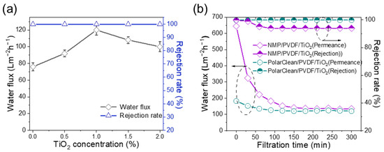 The separation performance of PVDF/TiO2 membranes by varying PVDF and TiO2 concentration. (a,b) Rejection and comparison of PolarClean/PVDF/TiO2 membrane and NMP/PVDF/TiO2 membrane in the separation of solid–liquid system (trans-membrane pressure is 0.5 bar).