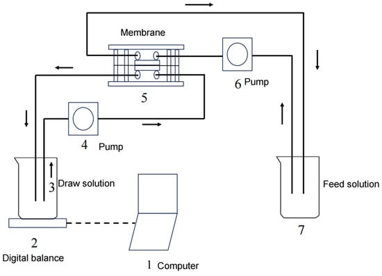 The experiments were performed using a custom-made flat organic glass cell with symmetric channels on both sides of the membrane, allowing for both the FS and DS to flow tangentially into the membrane. Each channel was 100 mm long, 45 mm wide, and 2 mm deep. The effective membrane area was about 0.004 m2. The FS and DS were separately circulated through the corresponding channels in a closed loop using two identical peristaltic pumps (YZ1515X, Baoding, China). Two temperature control devices (XMTD-204, Zhengzhou, China) were used to maintain a constant solution temperature of 25 ± 1 °C. The water flux was calculated using data recorded using a balance (BSA202S-CW, Gottingen, Germany). A schematic diagram of the FO system is shown in Figure 1. A virgin membrane was used in each experiment in order to compare the results under the same conditions. Prior to each experiment, the virgin membrane was soaked in deionized (DI) water for at least 24 h. The FO membrane was initially stabilized for 60–120 min with DI water as the FS and the corresponding solution as the DS. After that, experiments under different conditions were performed, and the water flux was determined. In the experiment, as water diffused through the membrane, the DS concentration slowly decreased. In order to maintain constant osmotic pressure, a high-concentration solution was continuously added to the DS to keep the concentration constant. All the tests were repeated three times.