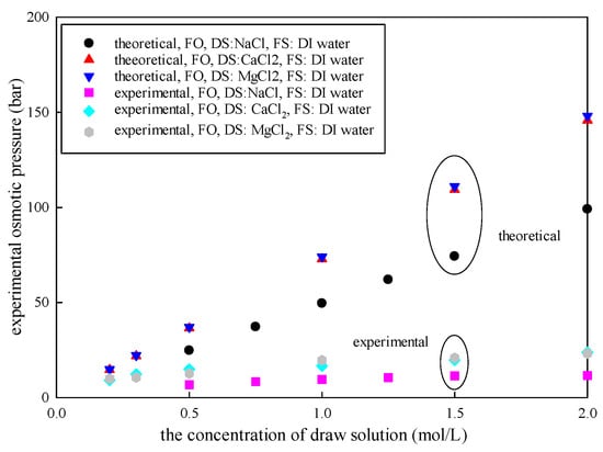 According to van’t Hoff’s equation, the theoretical osmotic pressure is directly proportional to the solution concentration in a dilute solution [21,34]. This indicates that higher DS concentration causes greater osmotic pressure. As shown in Table 1 and Figure 2, increased from 24.5 bar to 99.1 bar as the concentration of NaCl increased from 0.5 mol/L to 2 mol/L. Meanwhile, increased from 6.71 bar to 11.59 bar. However, there was a nonlinear relationship between the experimental osmotic pressure and the DS concentration. A similar effect was observed when the DS was CaCl2 or MgCl2. Notably, that there was also a significant difference between and .