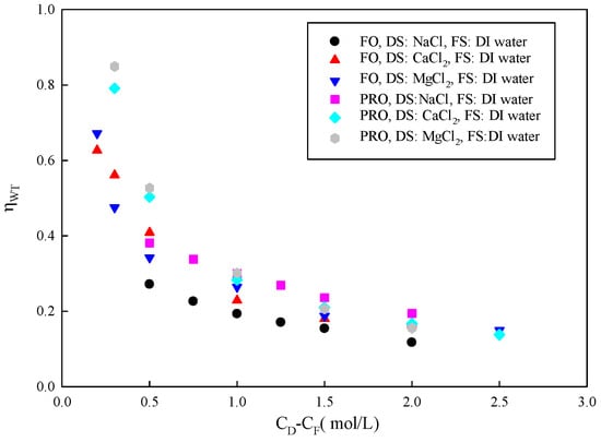 is the ratio of experimental water flux to the maximum possible water flux passing through the membrane in an imaginary membrane system that has no FO effects at all (the difference in the chemical potential between the DS and FS is zero, but with an applied ΔP equal to ). Therefore, it successfully simulates substance transport in FO membranes. A high value of represents the FO membrane’s high mass transfer efficiency. Figure 3 shows the relationship between and concentration gradient. When the FS is DI water, the value of decreases with increasing DS concentration. Both and increase with an increased concentration gradient across the membrane. It seems that water transfer efficiency should also have risen. In fact, gradually decreases. The reason may be that the solute reverse flux increases with increasing DS concentration when using an electrolyte as the solute. Due to the opposite direction of motion, the solute may interfere with water transmission [35]. In addition, solutes may be adsorbed in the membrane, blocking water permeation, increasing membrane resistance, and reducing forward mass transfer efficiency.