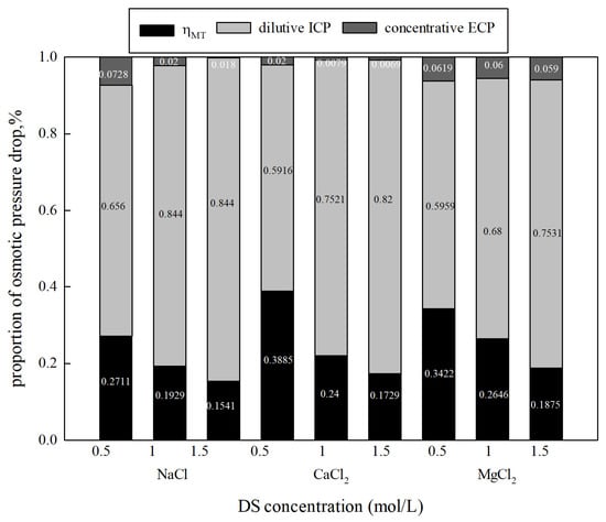 In order to understand the negative influence of CP, the proportions of osmotic pressure drop caused by different CPs can be calculated using a mathematical simulation model, such as Equations (26) and (27). From Figure 4, it can be seen that as the concentration of NaCl, CaCl2, and MgCl2 increased from 0.5 mol/L to 1.5 mol/L, the proportion of dilutive ICP showed a significant increase from 65.5% to 84.4%, 59.16% to 82.01%, and 59.59% to 75.31%, and , a parameter representing water permeation efficiency, decreased from 27.11% to 15.41%, 38.85% to 17.29%, and 34.22% to 18.75%, respectively. There are differences in both the theoretical and experimental osmotic pressure caused by different types of draw solutions at the same concentration. Therefore, ηWT and CP in different types of draw solutions are differentiated. The results also suggest that the concentration gradient in the boundary layers increases as the DS concentration increases, resulting in extensive polarization of dilutive ICP. Concentrative ECP has little effect on the osmotic pressure drop, accounting for less than 8% in all tests. ICP plays a more prominent role in the osmotic pressure drop at higher DS concentrations. However, the influence of ECP cannot be ignored, as shown in previous studies, especially in high-salinity solutions [21]. Therefore, both ECP and ICP could be responsible for the reduction in osmotic pressure.