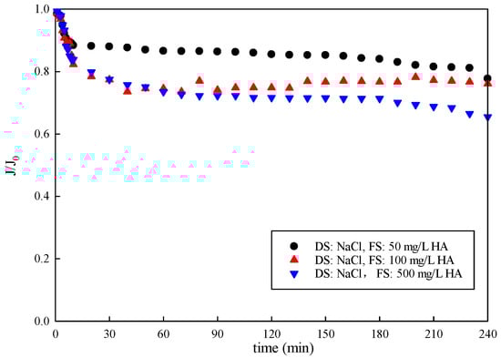 The results of the normalized water flux with an organic concentration in the feed solution are displayed in Figure 5. The water flux decreased with the increasing organic concentration in the FS in FO mode. The water flux gradually decreased to 77.70%, 76.13% and 65.53% at organic concentrations of 50 mg/L, 100 mg/L, and 500 mg/L, respectively. Flux decline dropped sharply with the organic concentration of 500 mg/L compared to 50 mg/L and 100 mg/L. As the organic concentration in the FS increased, the water flux decreased. Furthermore, the trend of water flux decline was similar, with a rapid decrease in the beginning (initial 30 min) followed by a slower phase with constant water flux loss. It reveals different fouling mechanisms governing the two filtration stages. Foulant–membrane interactions determined fouling behavior in the beginning, and foulant–foulant interactions dictated the performance in the later slow phase. Organics may penetrate the membrane, causing pore plugging, or absorb on the membrane surface with water permeation, hindering water transmission. A cake layer was formed and accumulated on the membrane surface, leading to a further decrease in the flux [36,37,38].