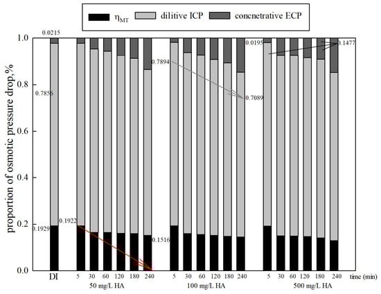 The membrane performance when using 1 mol/L NaCl as the DS and 500 mg/L HA as the FS is shown in Figure 9. The pure water flux in PRO mode (21.55 LMH) is higher than that of FO mode (13.84 LMH). This is due to less severe concentrative ICP (0.036) in PRO mode compared to dilutive ICP (0.78) in FO mode [39]. In the presence of organics, a greater decrease in the water flux is observed in PRO mode compared to FO mode. In FO mode, the water flux decreased to 65.53% at the end of the filtration. However, in PRO mode, the water flux declined to 15.74%. Figure 9 also displays the proportions of osmotic pressure drop caused by CP in different membrane orientations. Dilutive ICP and concentrative ECP occur in FO mode, while dilutive ECP and concentrative ICP occur in PRO mode [24]. Dilutive ICP shows a significant negative effect on osmotic pressure in FO mode. The proportion of dilutive ICP decreased by 6.22%, while the proportion of concentrative ECP increased by 12.62%. At the same time, declined by 6.4%. However, in PRO mode, both the proportions of dilutive ECP and concentrative ICP increased from 69.26% to 90.23% and 3.04% to 5.35%. Only gradually decreased by 23.29%. The results reveal that dilutive ECP is dominant in PRO mode. The proportions of the osmotic pressure drop caused by CP in PRO mode are higher than those in FO mode. The large pore sizes, high porosity, and rough structure of the support layer enable significant pore blocking and the formation of a cake layer in the support layer in PRO mode, enhancing CPs and causing a sharp decline in the flux (water flux decreases by 84.26%). Previous literature has reported that dilutive ECP in the boundary layer and ICP can significantly undermine the performance of a system [20,21].