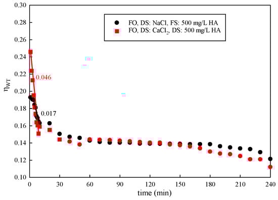 Experiments were conducted with different types of DSs. The results are shown in Figure 7. The membrane water transfer efficiency was improved via the high osmotic pressure provided by CaCl2. However, the water transfer efficiency significantly decreased with the use of CaCl2 as the DS. In the initial 30 min, the water transfer efficiency decreased sharply. The decline rate of using CaCl2 (0.046) as the DS was almost three times higher than that of NaCl (0.017). After this, it decreased slowly. Upon completion of the 240 min study, gradually decreased to 66.94% and 44.02% with a DS concentration of 1 mol/L NaCl and CaCl2, respectively. The solute’s reverse permeation behavior is common during the FO process. Ca2+ binds with carboxylic acid groups in natural organic matter, leading to a significant drop in water transfer efficiency [42,43].