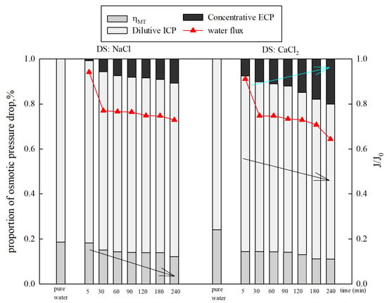 Figure 8 displays the proportions of osmotic pressure drop caused by CP under different types of DSs. It was found that the dilutive ICP was responsible for 81.44% (NaCl) and 80.09% (CaCl2) of the osmotic pressure loss in the initial stage. Then, the proportions of osmotic pressure drop caused by dilutive ICP slowly decreased from 81.44% to 77.09% (NaCl) and 80.08% to 68.98% (CaCl2). The influence of concentrative ECP on the osmotic pressure drop increased from 0.69% to 10.77% (NaCl) and 7.46% to 19.98% (CaCl2), while gradually decreased from 19.29% to 12.13% (NaCl) and 24.01% to 11.04% (CaCl2). The results show that dilutive ICP is more important than the concentrative ECP on the osmotic pressure drop under FO mode.