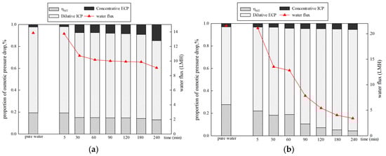 Proportions of osmotic pressure drop and water flux over time under different membrane orientations. (a) DS 1 mol/L NaCl, FS: 500 mg/L HA, FO mode (b) DS 1 mol/L NaCl, FS: 500 mg/L HA, PRO mode.
