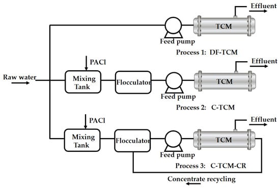- Process 3: Coagulation–tubular ceramic membrane with concentrate recycling (C-TCM-CR).