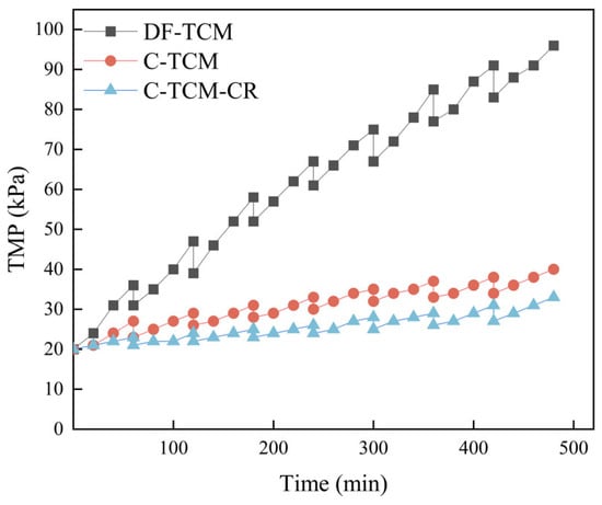 TMP serves as a vital parameter reflecting membrane fouling severity, directly correlating with hydraulic resistance during filtration [32]. Figure 2 illustrates the TMP variations across the three processes. The C-TCM-CR process demonstrated superior performance, with TMP increasing merely to 33 kPa after eight filtration cycles, representing 83% and 35% reductions in TMP elevation compared to DF-TCM and C-TCM processes, respectively. Specifically, the standalone C-TCM process reached a terminal TMP of 40 kPa, while DF-TCM exhibited the most severe fouling with a final TMP of 96 kPa. These findings conclusively indicate that: coagulation significantly alleviates membrane fouling relative to DF-TCM, and the integrated C-TCM-CR approach achieves optimal fouling mitigation through synergistic effects of enhanced coagulation and hydrodynamic control.