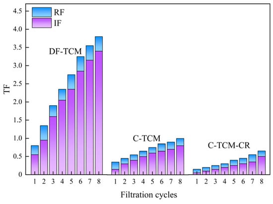 Figure 3 delineates the fouling characteristics of three operational processes across successive filtration cycles. The C-TCM-CR process demonstrated the most effective fouling control, with TF ultimately reaching 0.65 and an average RF of 0.13, which accounted for the highest proportion of TF, highlighting its superior hydraulic backwashing efficiency. This enhanced performance stemmed from synergistic mechanisms: the loose cake layer generated by coagulation mitigated fouling, cross-flow shear stress reduced cake layer adsorption load, and concentrate recirculation further optimized coagulation and floc structure. In comparison, the C-TCM process exhibited a higher TF of 1.0 at the filtration endpoint, though still significantly lower than direct filtration, with an average RF of 0.17 attributed to improved backwashing efficiency from its porous cake layer. In contrast, the DF-TCM process showed severe contamination (TF 3.8 after eight cycles) and poor reversibility, as hydraulic backwashing removed only 0.36 RF on average, reflecting limited mitigation capacity.