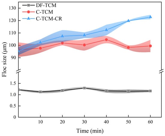 The flocs generated during the coagulation pretreatment phase directly influence the extent of TCM fouling [12,20]. Figure 4 illustrates the variations in floc size during the flocculation stage. Experimental results revealed that the contaminant particle size in the raw water was predominantly concentrated around 0.987 μm, with a significant presence of fine particles and colloidal substances. The DF-TCM process led to the formation of dense and compact cake layers on the membrane surface, resulting in severe fouling. Coagulation facilitated the aggregation of suspended particles, colloids, and macromolecular organics into flocs with an average floc size of 99.8 μm. These flocs formed a porous cake layer on the membrane surface, effectively alleviating fouling. The C-TCM-CR process further optimized floc structure and enhanced coagulation performance. During the initial filtration phase, the average floc size was 95.4 μm. As filtration and concentrate recirculation progressed, the floc size gradually increased, reaching 122.8 μm after 1 h. In contrast, the floc size remained relatively stable in the standalone coagulation process, while direct filtration resulted in smaller particle sizes that aggravated membrane fouling. Previous studies have demonstrated that the floc size and fractal dimension in coagulation significantly influence cake layer formation. Larger flocs facilitate the development of a functional porous cake layer, which effectively intercepts smaller contaminants and mitigates membrane fouling [31,33].