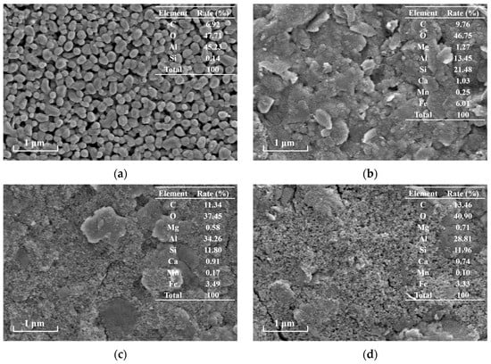 SEM analysis was performed to investigate the microstructural characteristics of TCM under different operational conditions, as shown in Figure 5. The virgin membrane (Figure 5a) exhibited uniformly distributed pores with well-defined morphology, and energy-dispersive X-ray spectroscopy (EDS) confirmed its primary composition of Al, O, and trace C. For operational processes, the C-TCM-CR process (Figure 5b) formed a porous cake layer with high structural integrity, whereas the standalone C-TCM (Figure 5c) showed moderately compacted deposits. In stark contrast, DF-TCM (Figure 5d) resulted in dense fouling layers completely occluding membrane pores. Elemental mapping revealed significantly elevated Al content in coagulation-assisted processes compared to DF-TCM, directly attributable to PACl residuals rather than membrane constituents. This porous architecture in C-TCM-CR was governed by hydrodynamic shear forces induced by cross-flow filtration, which dynamically maintained cake layer permeability through two synergistic mechanisms: selective removal of loosely bound foulants and continuous recirculation of concentrated particles to enhance flocs growth in the flocculator.