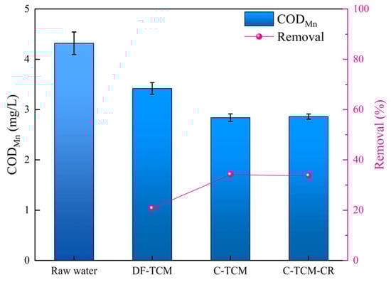 The permanganate index (CODMn), serving as a comprehensive indicator of oxidizable organic matter through potassium permanganate titration, revealed critical differences in dissolved organic matter removal across the evaluated processes. As depicted in Figure 6, the raw water exhibited an average CODMn of 4.32 mg/L. Coagulation-integrated processes demonstrated superior performance, with C-TCM and C-TCM-CR achieving 34% removal efficiency, significantly outperforming DF-TCM’s 21% reduction, which is consistent with previous studies [34,35]. This disparity stems from distinct removal mechanisms: DF-TCM primarily relies on size-exclusion (30 nm pores), exhibiting limited efficacy for sub-nanometer organics, whereas coagulation facilitates molecular aggregation of low molecular weight compounds into filterable flocs while forming porous cake layers that provide secondary adsorption sites [31,36,37].