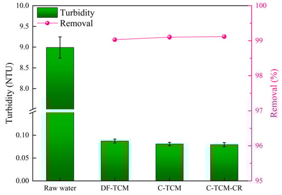 The raw water exhibited an average turbidity of 8.99 NTU. As illustrated in Figure 8, all three processes achieved comparable and stable turbidity removal efficiencies without statistically significant differences. Specifically, the C-TCM-CR process produced marginally lower effluent turbidity (0.079 NTU) compared to the C-TCM (0.080 NTU) and DF-TCM (0.087 NTU) processes. All three processes achieved over 99% turbidity removal efficiency, as the TCM demonstrates excellent filtration performance.