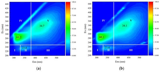 The fluorescence properties of humic acids, protein-like substances, and other fluorescent compounds in water were analyzed using three-dimensional excitation-emission matrix fluorescence spectroscopy, with distinct characteristic peaks corresponding to functional groups in specific fluorophores [29,40]. Figure 9 illustrates the removal efficiencies of fluorescent substances by the three treatment processes. The raw water displayed fluorescence response regions in regions II, IV, and V, attributed to aromatic proteins, soluble microbial products, and humic acids, respectively. Experimental results indicated that both C-TCM and C-TCM-CR process marginally improved the removal efficiencies of these fluorescent contaminants, achieving approximate removal rates of 5% for aromatic proteins, 9% for soluble microbial products, and 15% for humic acids. In contrast, direct filtration exhibited negligible removal efficiency. Humic acid-like pollutants were identified as a major contributor to irreversible ceramic membrane fouling. Compared to direct filtration, coagulation moderately enhanced humic acid removal, thereby alleviating membrane fouling due to their hydrophilic nature [21,31,41].