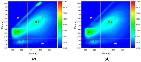 Fluorescent compounds removal efficiency across the three processes: (a) Raw water; (b) DF-TCM; (c) C-TCM; and (d) C-TCM-CR.