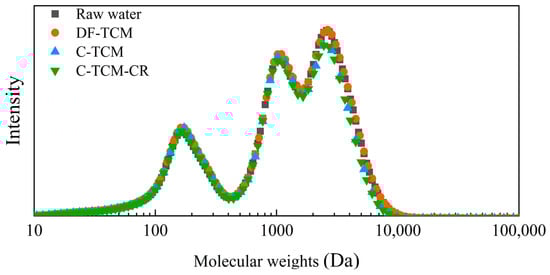 GPC was employed to analyze organic matter molecular weight distribution by correlating retention times with a calibration curve established using standard molecular weight markers. The organic content was quantified based on UV absorbance at 254 nm. As shown in Figure 10, raw water primarily contained organics in the 100–10,000 Da range. TCM processes with coagulation exhibited limited removal (average 10%) of medium molecular weight organics (2000–10,000 Da), predominantly humic-like substances, consistent with findings from three-dimensional fluorescence analysis. In contrast, DF-TCM showed negligible removal of these sub-30 nm pore-sized organics. This enhanced removal in coagulation-assisted processes likely stems from porous cake layer adsorption, which prevents direct contact between low molecular weight organics (<2000 Da) and membrane surfaces, thereby reducing their permeation [42,43]. The nominal 30 nm membrane pore size corresponds to a theoretical 100,000 Da molecular weight cut-off, though this relationship is influenced by molecular shape, polarity, and other physicochemical interactions, yet actual retention efficiency for smaller organics relies heavily on synergistic cake layer filtration mechanisms rather than pure size exclusion [12,40].