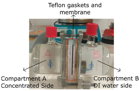 A diffusion cell with an active area of 13.85 cm2 of the membrane and 120 mL of the volume of each compartment were used to determine the permeability of the membrane (Figure 1). DI water was sprayed on the surface of membrane before placing it between compartments, and a solution of 1 M NaCl was used for NaCl in the concentrated side of the cell (compartment A). The other side, compartment B, was filled with ultrapure water.