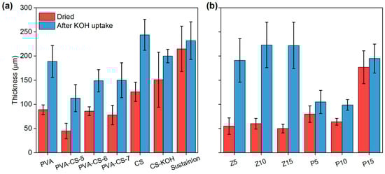 Membrane thickness before and after KOH uptake: (a) PVA, CS and Sustainion membranes; (b) ZnO- and POP added PVA-CS membranes.