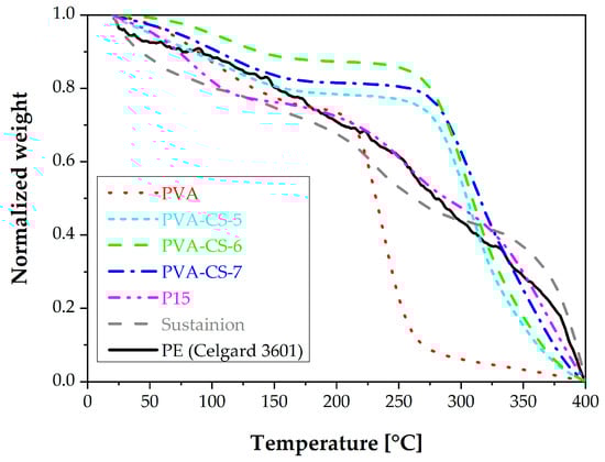 The thermal decomposition of several of the membranes measured under a N2 flow of 50 mL/min from 25 to 400 °C [36] is plotted in Figure 6, with the polyethylene Celgard separator and Sustainion commercial anion-exchange membranes as references. The weight loss between 200 and 350 °C was caused by the decomposition of CS and PVA. While chitosan can degrade from 230 °C up to 400 °C, PVA degradation starts around 300 °C [37,38]. The PVA-CS membranes generally present the typical stages expected of PVA and CS blends. The CS increases the thermal stability of PVA, especially in a 60:40 wt.% ratio. That is why this blend composition was retained for the MMMs. As an example, the P15 membrane sample shows similar behavior to the unfilled PVA-CS blend membranes. This proves good compatibility between the porous filler and the polymeric matrix. The thermal decomposition increases as a function of the blend ratio and porous filler loading, as can also be observed in Table 5. This table also collects the bound water content calculated with the method reported by Franck-Lacaze et al. [36]. The values agree with the literature on AEMs and previous results obtained at the University of Cantabria for other PVA-CS membranes as alternative to Dupont and Fumatech ion exchange membranes in a polyelectrolyte membrane reactor for organic electrosynthesis at high pH [11]. The thermal decomposition of the Sustainion membrane is different than the PVA-CS membranes because of the differences in the polymer framework, made of imidazolium and polystyrene or a polyethylene substrate, respectively.