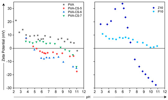 In addition to the uptake and ion exchange properties of the membranes, we determined the zeta potential of membrane surfaces in various pH values (Figure 7). While the PVA membrane exhibits positive zeta potential values in the whole pH range, the PVA-CS blend membranes show more negative surface charge at high pH values. The PVA-CS membranes show similar trends to those in the literature, as decreasing the pH of the solution resulted in an increased zeta potential result. Kyona et al. found out that various CS (content up to 40%) membranes have higher zeta potential values when the pH of the environment decreases [39]. The increase in zeta potential is the result of the protonation of the amino groups in the CS structure. The optimum amount of CS is 60 wt.% in the blend, which results in the lowest surface charge almost at all pH values, between −15.0 and 7.7 mV for pH 11 and pH 3.8, respectively. CS has positive charge below pH 6.3, whereas it is uncharged above this value [40]. At high pH, OH groups can readily deprotonate, generating a negative charge on the surface, while at low pH, NH2 groups can readily protonate, creating a positive charge on the surface. Thus, the surface charge becomes negative due to the domination of the OH group in the structure. Observing the MMMs with ZnO and POP nanoparticles in PVA-CS, the addition of ZnO results in a higher isoelectronic point compared with that of PVA membrane. This is attributed to the fact that ZnO nanoparticles have an isoelectric point above 8.7, showing a negative surface charge at this pH value [41]. On the other hand, adding POP particles results in a zeta potential close to that of pure PVA. This is expected due to the lack of charged sites in the structure.