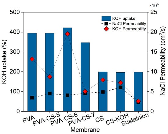 The relationship between KOH uptake and permeability values is shown in Figure 8. While NaCl permeability has similar values due to the similarities in IEC of the PVA, CS and PVA-CS membranes, an optimum amount of CS results in high KOH uptake (422 wt.%) with high KOH permeability, 19.6 × 10−6 cm2/s, which is four times higher than that of the other membranes.