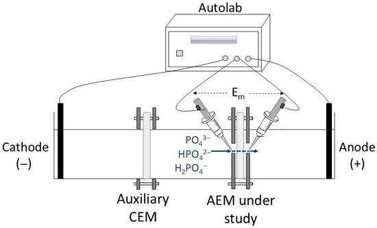Figure 1 and Figure S1 of the Supplementary Material present a schematic representation and a photograph of the electrochemical cell used, respectively. The cell consisted of three compartments with an AEM and a CEM separating the anode and cathode chambers, respectively, from the central (dilute) compartment. The three compartments contained the same working solution in each experiment. The membranes under evaluation (AEM) had an effective area of 1 cm2, while the effective area of the auxiliary CEM membrane was 12.6 cm2. The latter was included to minimize the effects of cathodic reactions on the ionic transport through the AEM, by restricting hydroxyl ions transport toward the central compartment. Two graphite electrodes were present at each end of the cell for the application of electric current, which were connected to an Autolab PGSTAT302N potentiostat/galvanostat (Metrohm, Herisau, Switzerland). Ag/AgCl reference electrodes, immersed in Luggin capillaries, were placed at each surface of the membrane under evaluation for measuring the potential drop (Em) of the membrane/solution system under different current densities. The experiments were conducted at room-controlled temperature (approximately 25 °C) both with and without stirring. In the experiments with stirring, only the central compartment was agitated using a magnetic stirrer at 400 rpm, ensuring solution homogenization without vortex formation. Prior to each experiment, the membranes were kept immersed in the working solution for 24 h to reach an equilibrium of counter-ions exchanged with the membrane fixed charges.
