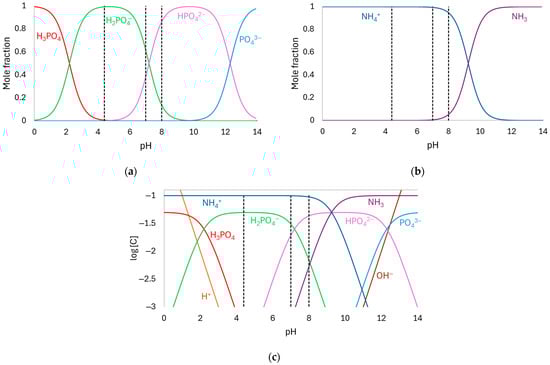 Speciation diagram of (a) phosphate, (b) ammonium, and (c) phosphate and ammonium compounds in aqueous solution. The dashed lines indicate the specific pH values examined in this study (4.4, 7, and 8).