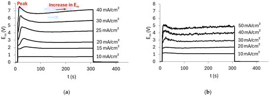 In both cases, the curves obtained at the lowest current densities (e.g., 10 mA/cm2) remained constant over time, which is attributed to ion transport being governed by diffusion and mainly migration mechanisms across the membrane. As the applied current increased, the curves exhibited a rapid rise in Em within a very short time after current application, reaching a peak (indicated in Figure 3a), followed by a drop in Em until a quasi-steady state was achieved. It is well known that when the membrane/solution system operates above its limiting current density, the dominant transport mechanisms become electroconvection and/or gravitational convection, in addition to possible water dissociation taking place at the membrane surface. In the present case, the Em peak likely emerged as a result of water dissociation occurring in the diffusion boundary layer, which induced an equilibrium shift in the membrane/solution system and consequently altered the conductivity of the species transported through the membrane [29,30], as will be discussed below. It is worth noting that the time required for the sharp increase in Em (commonly referred to as the transition time) is shorter under stirred conditions, which can be explained by the enhancement of electroconvection due to forced convection [31]. Following the sharp drop in Em, a gradual increase over time is observed (also indicated in Figure 3a)—especially at higher current densities (e.g., 40 mA/cm2)—which can also be attributed to the shift in the chemical equilibrium occurring in both the diffusion boundary layer and within the membrane structure [12,32,33].
