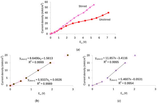 (a) Current–voltage curve for the AMV membrane in a 0.05 mol/L solution at pH 7, recorded under both unstirred and stirred conditions. Panels (b,c) show the magnified view of the ohmic regions of the unstirred and stirred systems, respectively.