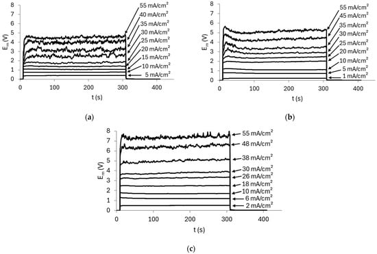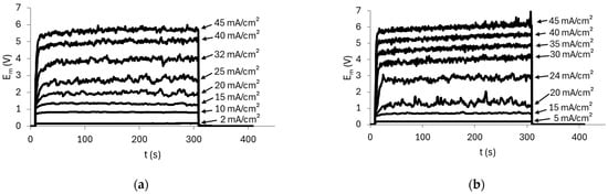 Using the Em data obtained from the chronopotentiometric tests, CVCs were constructed, as shown in Figure 10, while the values of ilim, Rohm, and Roverlim extracted from the curves and Qeq− calculated using Equation (5) are presented in Table 4.